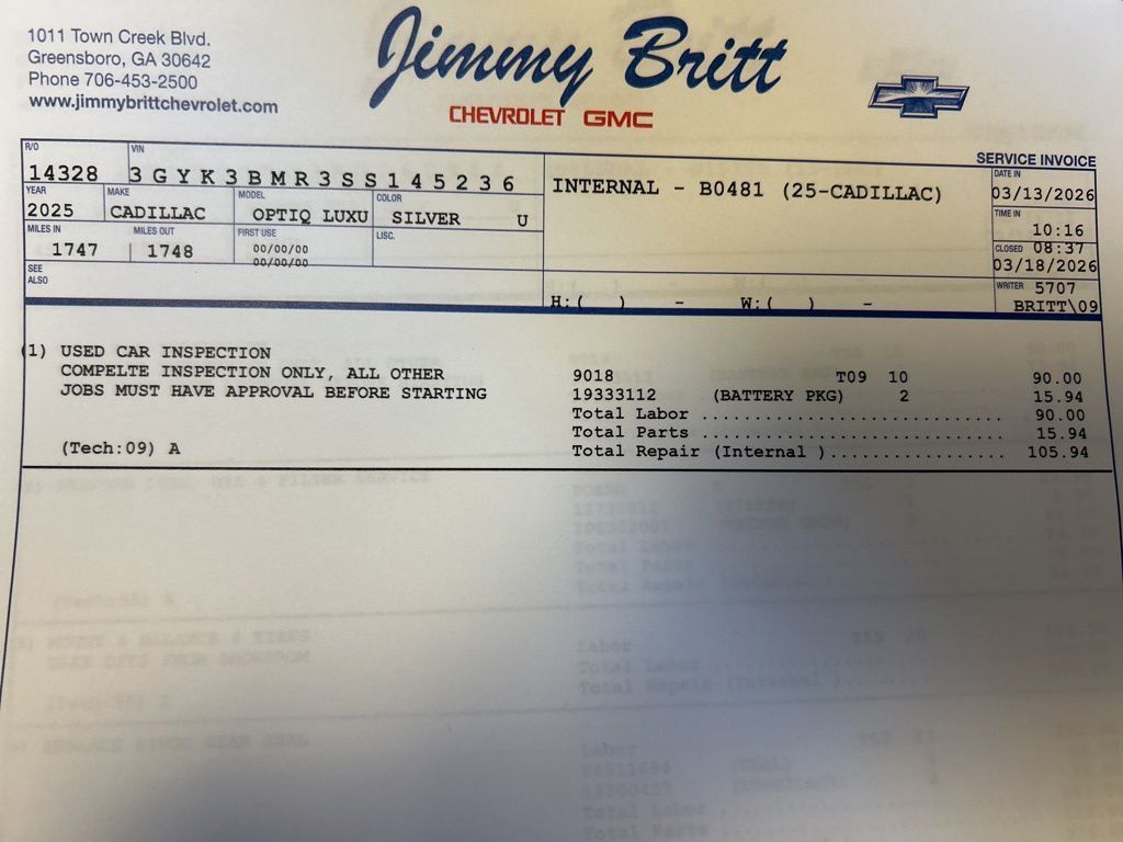 *The Jimmy Britt Premium Delivery Program lets you buy this vehicle right from the comfort of your couch. We frequently deliver vehicles nationwide, and even arrange test drives at home, if you are nearby. We will send you a personal video on any vehicle you are interested in. Call, email, or text us for details.* (Plus, you get our low-price guarantee and 2 free oil changes and tire rotations!) Ask for the vehicle history report! Odometer is 3519 miles below market average! Priced below KBB Fair Purchase Price!Automatic Headlights, Rearview Camera, Bluetooth, Leather, 1 Owner, Heated Front Seats, Heated Steering Wheel, Remote Starter System, Mutli-function Steering Wheel, 4X4, Includes the Remainder of the Factory Warranty, Extended Warranty Available, ONSTAR, Push Button Start, Remote Keyless Entry, Premium Delivery Service Available, OPTIQ Luxury, 4D Sport Utility, Electric ZEV 300hp, AWD, Argent Silver Metallic, Sky Cool Gray with Santorini Blue Accents w/Inteluxe Seat Trim, 19 Speakers, 6-Way Power Front Passenger Seat Adjuster, AKG Studio 19-Speaker System, Automatic temperature control, AutoSense Hands-Free Power Liftgate, Driver Seat Memory, Emergency communication system: OnStar and Cadillac connected services capable, Front dual zone A/C, Google Built-in, Heated Front Seat Cushions and Seatbacks, Heated front seats, Heated steering wheel, Inteluxe Seat Trim, LED Reflective Windshield Collision Alert, Low tire pressure warning, Navigation System, Navigation system: Google Automotive Services Capable, Power driver seat, Power Liftgate, Power Massage Driver Seat, Power Massage Front Passenger Seat, Power passenger seat, Preferred Equipment Group 1SC, Radio: Infotainment Experience, Rain sensing wipers, Rear anti-roll bar, Remote keyless entry, SiriusXM with 360L Trial Subscription, Wheels: 20" Pearl Nickel Painted Alloy.Argent Silver Metallic 2025 Cadillac OPTIQ Luxury Electric ZEV 300hp AWDThe Jimmy Britt Automotive Family has received multiple Dealer of the Year awards in the state of Georgia. We've also been awarded the Customer Satisfaction Award through DealerRater! Price does not include State/County/Local Tax, Tag, GA Lemon Law or Registration fees. Dealer administrative fee is included in the price. We offer electronic tag and title as an option for an additional fee (this fee is based on what your state/county charge to participate as well as a fee to the company we select to process). A fee may be charged to customers wishing to have the vehicle delivered. Preowned Vehicles - All preowned inventory is “As Is” unless GM Certified or otherwise stated in writing. While we make every effort to ensure the data listed here is correct, there may be instances where some of the factory rebates, incentives, options, or vehicle features may be listed incorrectly as we get data from multiple data sources.