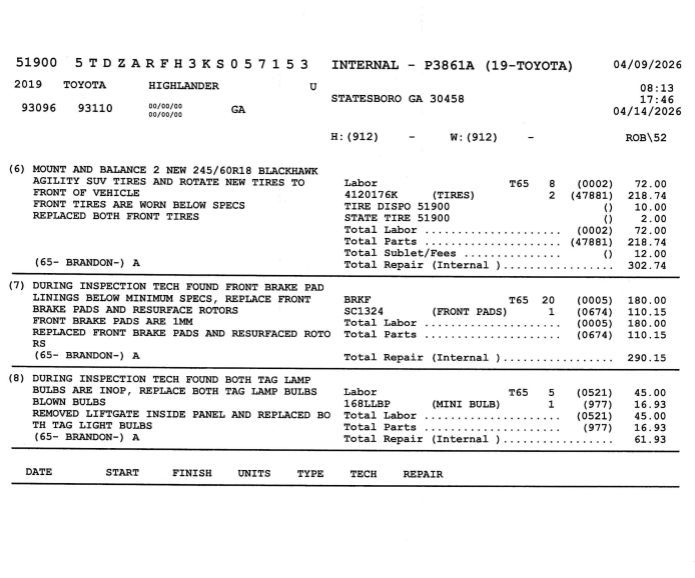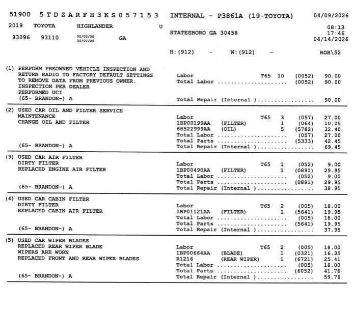 *The Jimmy Britt Premium Delivery Program lets you buy this vehicle right from the comfort of your couch. We frequently deliver vehicles nationwide, and even arrange test drives at home, if you are nearby. We will send you a personal video on any preowned vehicle you are interested in. Call, email, or text us for details.* (Plus, you get our low-price guarantee and 2 free oil changes!) Priced below KBB Fair Purchase Price! Odometer is 2243 miles below market average!Clean Autocheck / No Accidents, Extended Warranty Available, Bluetooth / Hands-free, 3rd Row Seats, Back-Up Camera w/ Guidelines, Cruise Control, Portable Audio Connection, Power Locks, Power Windows, Premium Wheels, Multi-function Steering Wheel, *Premium Delivery Service Available*, 8-Passenger Seating, Highlander LE, 4D Sport Utility, Midnight Black Metallic, Ash w/Fabric Seat Trim, 4.356 Axle Ratio, AM/FM radio, Exterior Parking Camera Rear, Fabric Seat Trim, Front Bucket Seats, Low tire pressure warning, Radio: Entune Audio, Rear air conditioning, Rear anti-roll bar, Rear window wiper, Reclining 3rd row seat, Remote keyless entry, Wheels: 18" Split 5-Spoke Machined-Face Alloy.Midnight Black Metallic 2019 Toyota Highlander LE 2.7L 4-Cylinder DOHC 16V Dual VVT-i FWDAwards: * 2019 KBB.com Brand Image Awards * 2019 KBB.com Best Resale Value Awards * 2019 KBB.com 12 Best Family Cars The Jimmy Britt Automotive Family has received multiple Dealer of the Year awards in the state of Georgia. We've also been awarded the Customer Satisfaction Award through DealerRater! Price does not include State/County/Local Tax, Tag, GA Lemon Law or Registration fees. Dealer administrative fee is included in the price. We offer electronic tag and title as an option for an additional fee (this fee is based on what your state/county charge to participate as well as a fee to the company we select to process). A fee may be charged to customers wishing to have the vehicle delivered. New Vehicles - Must finance with Chrysler Digital to receive all rebates and incentives. Not all will qualify for Chrysler financing. See Dealer for details. Preowned Vehicles - All preowned inventory is “As Is” unless Chrysler Certified or otherwise stated in writing. While we make every effort to ensure the data listed here is correct, there may be instances where some of the factory rebates, incentives, options, or vehicle features may be listed incorrectly as we get data from multiple data sources.