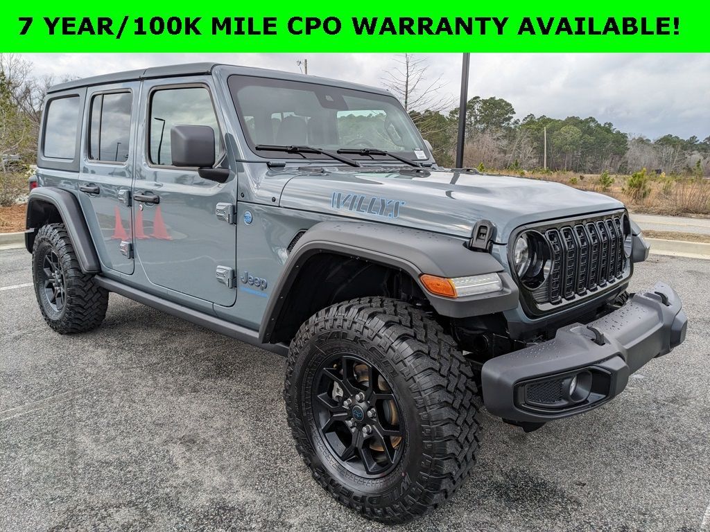 *Certified inspections have been completed and this vehicle meets all requirements for certification and is available upon request. Chrysler Certified brings with it the peace of mind protection of a 3 month/3,000 mile comprehensive warranty, and a 7year/100000mile powertrain warranty. (Plus, you get our low-price guarantee and 2 free oil changes!) *The Jimmy Britt Premium Delivery Program lets you buy this vehicle right from the comfort of your couch. We frequently ship vehicles, and even arrange test drives at home, if you are nearby. We will send you a personal video on any vehicle you are interested in. Call, email, or text us for details. Recent Arrival! Certified. Priced below KBB Fair Purchase Price!One Owner, Clean Autocheck / No Accidents, Factory Certified Preowned, Remaining Factory Warranty, Extended Warranty Available, Bluetooth / Hands-free, Apple Car Play / Android Auto Compatible, Back-Up Camera w/ Guidelines, Cruise Control, Portable Audio Connection, Premium Wheels, Multi-function Steering Wheel, Trailer Hitch, 4x4/4WD, Apple Carplay, Android Auto, *Premium Delivery Service Available*, iphone / Droid Navigation Compatible, Wrangler Willys 4xe, 4D Sport Utility, 8-Speed Automatic, 4WD, Anvil Clearcoat, Black w/Cloth Low-Back Bucket Seats, 4-Wheel Drive Swing Gate Decal, 4.10 Rear Axle Ratio, 7 & 4 Pin Wiring Harness, 97 MPH Vehicle Max Speed Calibration, AM/FM radio: SiriusXM, Apple CarPlay/Android Auto, Auxiliary Switches, Black 3-Piece Hard Top, Black Grille, Class II Receiver Hitch, Cloth Low-Back Bucket Seats, Conventional Differential Front Axle, E-Locker Rear Axle, Freedom Panel Storage Bag, Front LED Fog Lamps, Integrated roll-over protection, LED Premium Reflector Headlamps, Low tire pressure warning, Molded in Color Rubicon Highline Flare, Off-Road Plus Mode, ParkView Rear Back-Up Camera, Quick Order Package 29W Willys 4xe, Radio: Uconnect 5 w/12.3" Display, Rear anti-roll bar, Rear Window Defroster, Rear Window Wiper/Washer, Remote keyless entry, Wheels: 17" x 7.5" Painted Black, Willy's Suspension, Willys 4xe Hood Decal.FCA US LLC Certified Pre-Owned Details: * Warranty Deductible: $100 * Transferable Warranty * Powertrain Limited Warranty: 84 Month/100,000 Mile (whichever comes first) from original in-service date * Vehicles Up to 75,000 Miles and/or 5 Model Years. 24-Hour Towing & Roadside Assistance, Car Rental Allowance, CARFAX® Vehicle History ReportTM and an Introductory 3-month Subscription to SiriusXM® Satellite Radio & Certified Warranty Upgrades * Vehicle History * Limited Warranty: 3 Month/3,000 Mile (whichever comes first) after new car warranty expires or from certified purchase date * Roadside Assistance * 125 Point InspectionAnvil Clearcoat 2025 Jeep Wrangler Willys 4xe 2.0L I4 DOHC 4WDThe Jimmy Britt Automotive Family has received multiple Dealer of the Year awards in the state of Georgia. We've also been awarded the Customer Satisfaction Award through DealerRater! Price does not include State/County/Local Tax, Tag, GA Lemon Law or Registration fees. Dealer administrative fee is included in the price. We offer electronic tag and title as an option for an additional fee (this fee is based on what your state/county charge to participate as well as a fee to the company we select to process). A fee may be charged to customers wishing to have the vehicle delivered. New Vehicles - Must finance with Chrysler Digital to receive all rebates and incentives. Not all will qualify for Chrysler financing. See Dealer for details. Preowned Vehicles - All preowned inventory is “As Is” unless Chrysler Certified or otherwise stated in writing. While we make every effort to ensure the data listed here is correct, there may be instances where some of the factory rebates, incentives, options, or vehicle features may be listed incorrectly as we get data from multiple data sources.